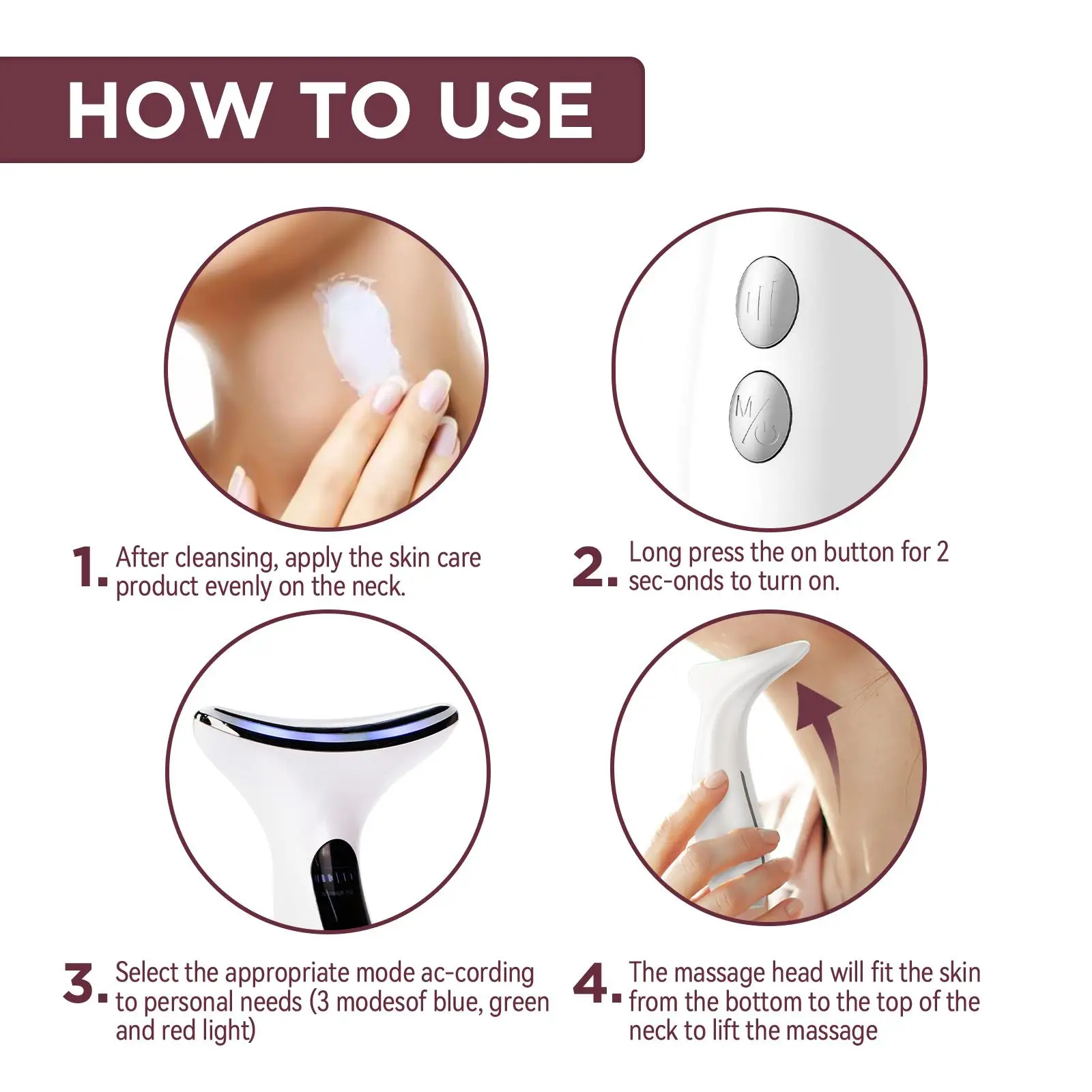 1. After cleansing, apply the skin care product evenly on the neck.2. Long press the on button for 2 seconds to turn on.