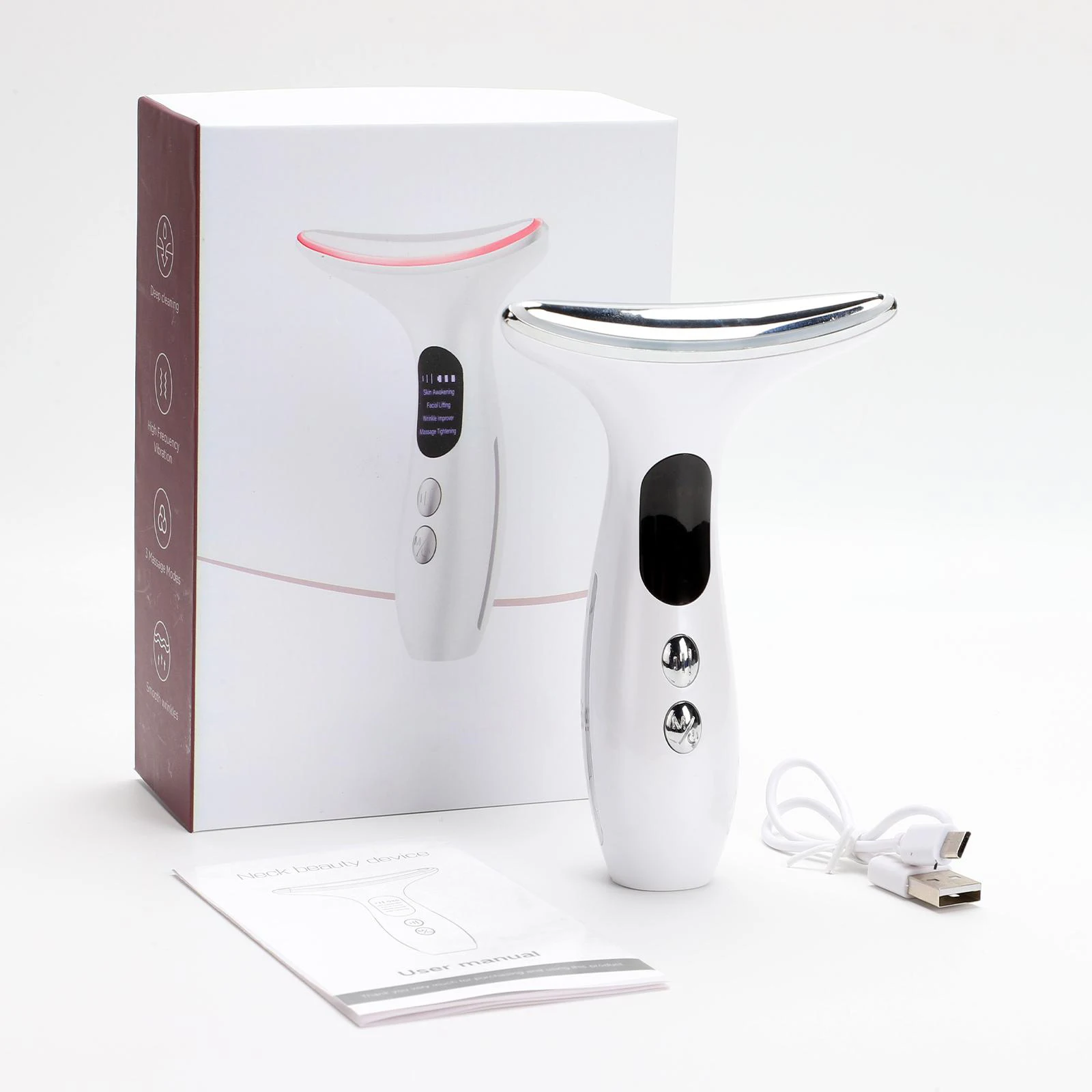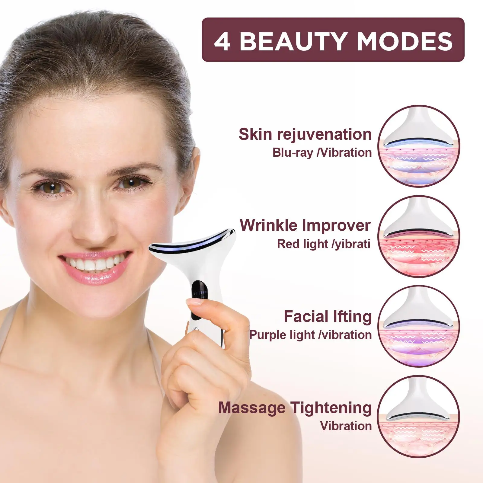1. Multi Modes: The neck beauty device features multi beauty modes, one device to meet your different daily skin care needs.2. Compact and Portable: The face and neck massager is compact and convenient, can be put in the travelling cosmetic bag, easy to use in different occasion.